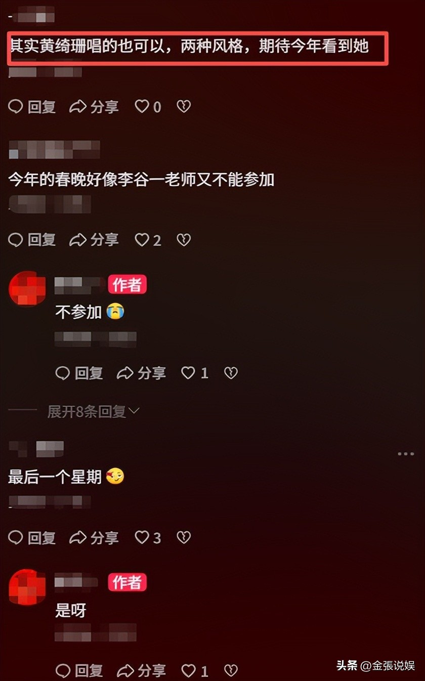 李谷一缺席春晚的消息传出来之后,黄绮珊在社交媒体上发了一条动态。