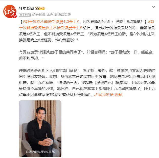 近日,演员彭于晏在采访中坦言,可以接受凌晨4点收工,却无法接受凌晨4点开工。他笑称:“因为凌晨4点开工的话,睡8个小时往回推就是晚上8点睡觉,谁8点睡觉?”